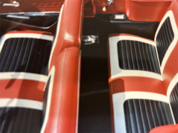 The dash and all instruments were removed, restored, and returned to the newly red painted dash. The seat springs were badly rusted so the 2-door sedan’s were used. Discovering the back seat was shorter in the convertible, he had to rebuild the springs before the seat upholstery, side panels, and rich black carpeting were installed.